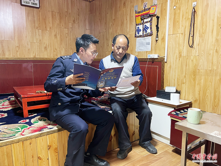 尕布藏尼玛用藏语为少数民族群众解读法治知识。(刚察县公安局供图)