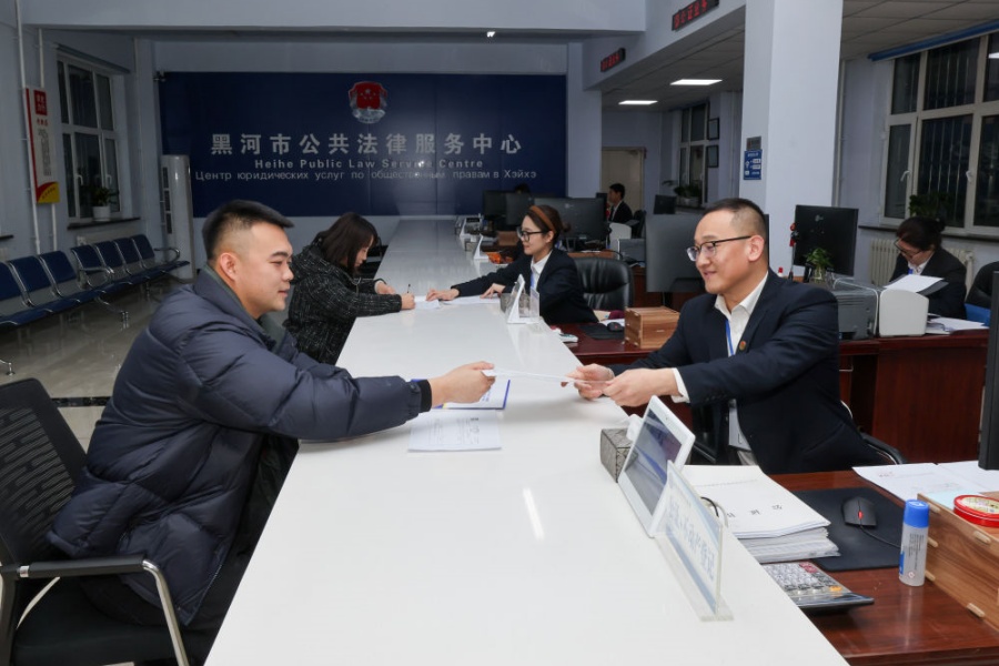 2024年12月10日,黑龙江省黑河市公共法律服务中心的工作人员在为涉外企业办理业务。新华社记者 殷刚 摄