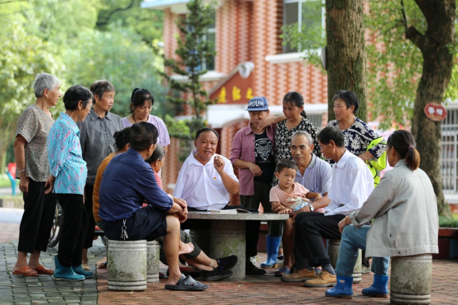 江西芦溪县宣风镇珠亭村人民调解员阳昌绍(中)为珠亭村的百姓宣讲民法典知识(2021年8月17日摄)。新华社记者 胡晨欢 摄
