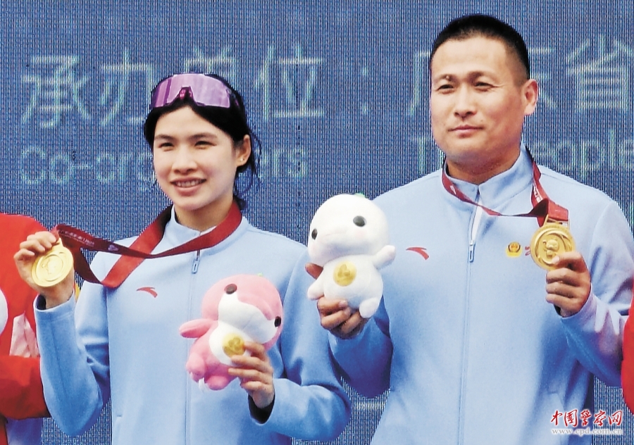 公安体育健儿黄安琪(左)与教练何浩伟一同登台领奖。(中国公安体育协会供图)