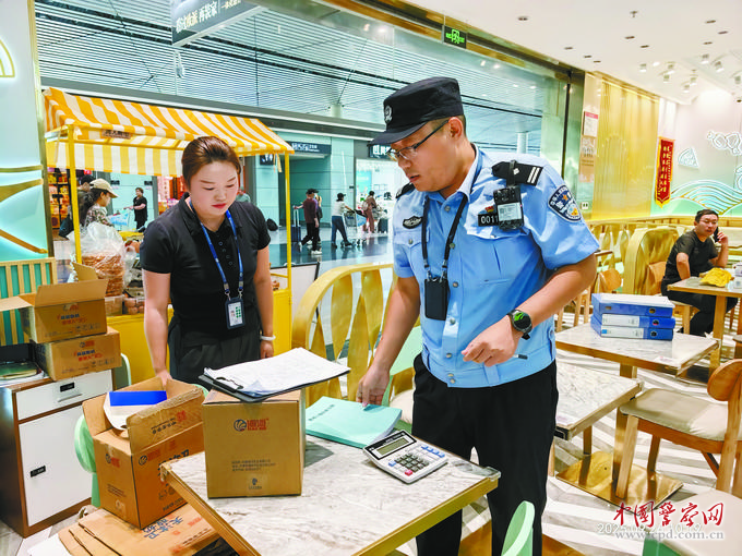 10月7日,首都机场公安局天津滨海国际机场分局民警深入机场航站楼内的商铺进行安全检查。刘斌 摄