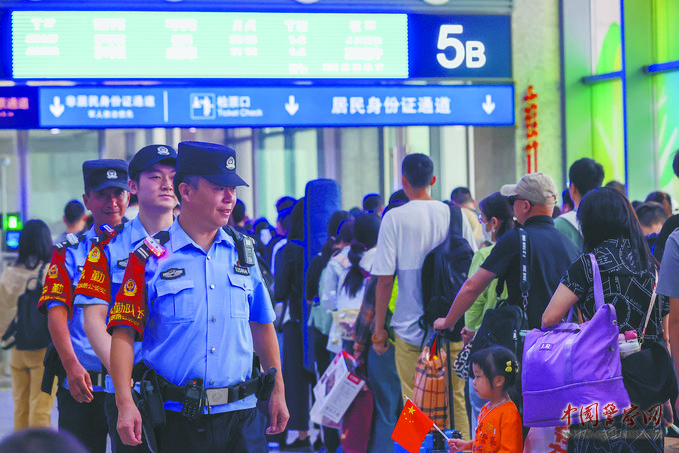 10月6日,成都铁路公安局重庆公安处沙坪坝站派出所民警在候车大厅巡逻。(成都铁路公安局供图)