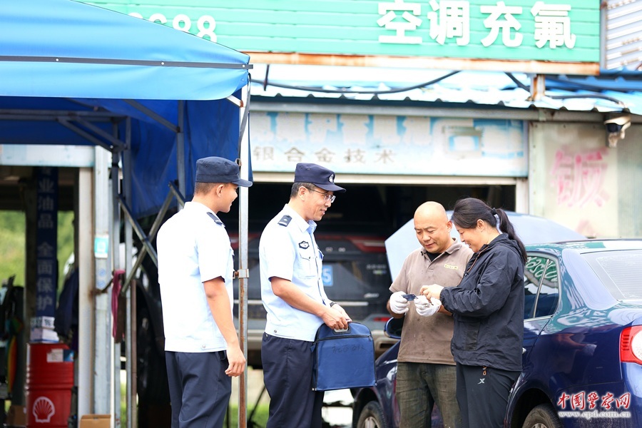 图为民警辅警发放警民联系卡及反诈宣传资料。