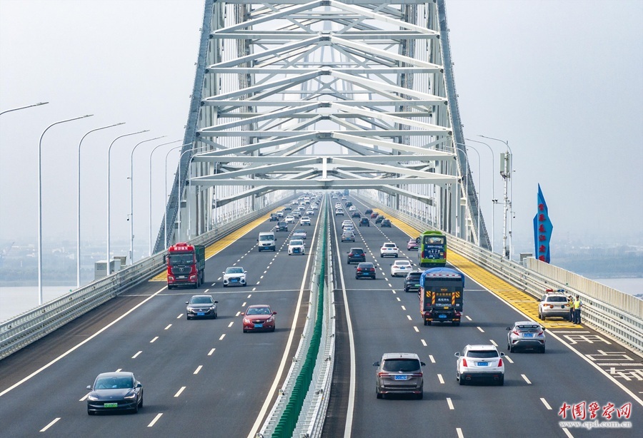 10月7日,江苏省泰州市公安局交警支队组织警力在常泰长江大桥开展常态化巡逻,守护群众平安返程。汤德宏 摄