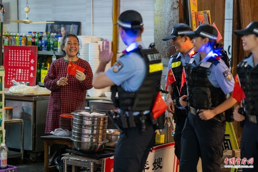 9月30日,江苏省镇江市公安局民警辅警在巡逻值守中,向商家讲解节假日安全防范知识。